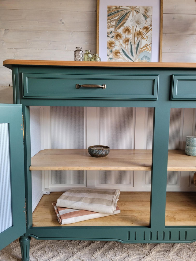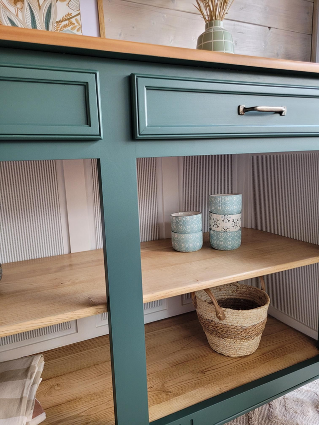 Son plateau en bois remis à brut contraste avec le corps peint en vert Séquoia mat, une teinte profonde et apaisante qui met en valeur ses lignes classiques. L’intérieur, peint en ton Meringue, et un papier peint à fines rayures pour une touche subtile et élégante.