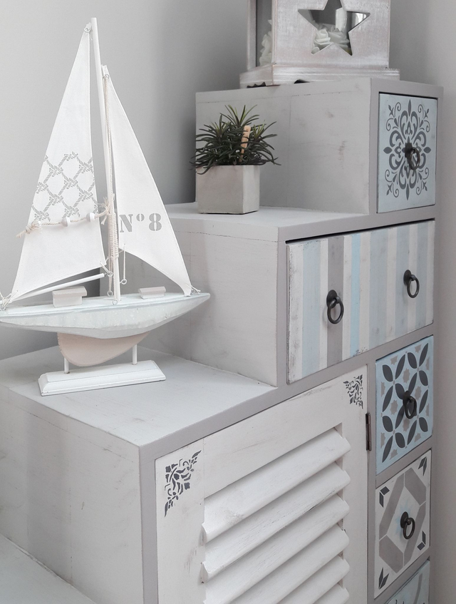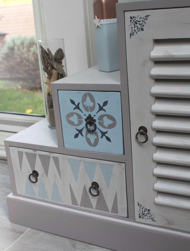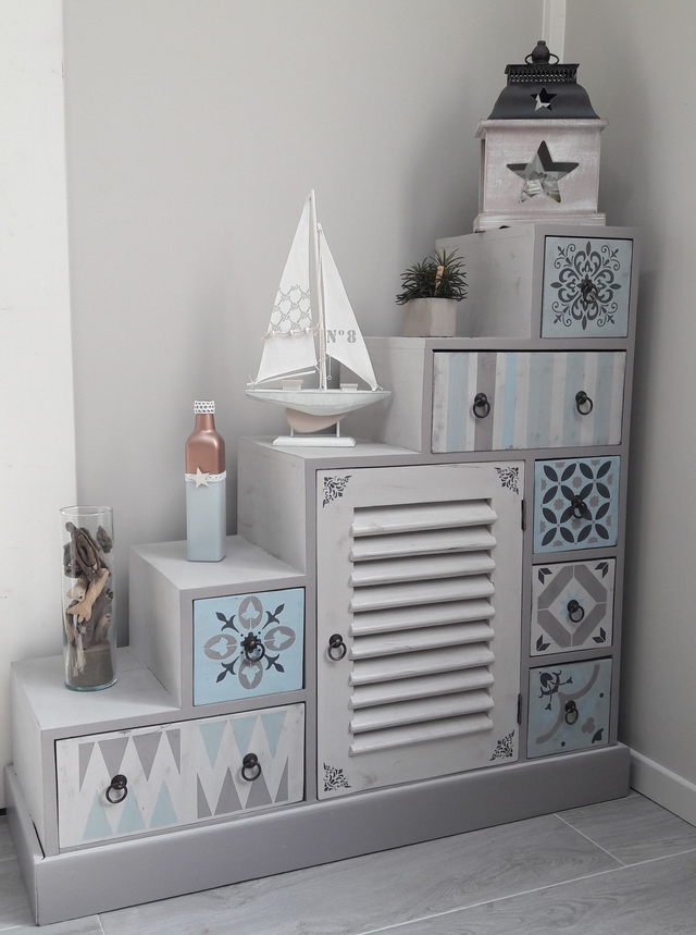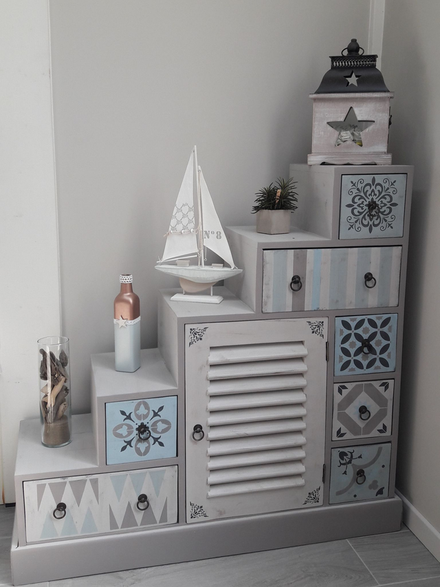 • Caractéristiques : 1 porte avec volet persienne, 7 tiroirs aux motifs uniques et personnalisés (pochoirs carreaux de ciment), parfaits pour organiser vos petits objets.